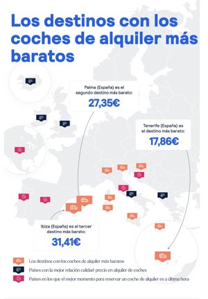 «Alquilar un coche te da la libertad de viajar a tu aire. Al igual que con los vuelos, nuestros datos sobre alquiler de coches se han extraído con el fin de ayudar a los viajeros a ahorrar y sacar el máximo partido a su presupuesto. Alquilar un coche puede ser algo tedioso y confuso, y a menudo los viajeros dejan la organización de esta parte de su viaje para el último momento. Con algunos trucos sencillos que poca gente conoce, los viajeros pueden conseguir ahorrar este verano».