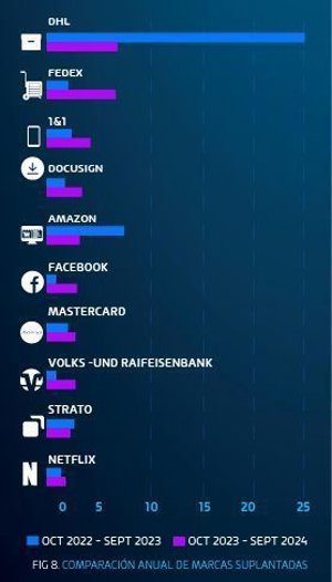 En el caso de DHL, aunque sigue siendo la marca más suplantada, ha experimentado un cambio radical y en 2024 la cantidad de intentos de suplantación fue solo una pequeña parte de los registrados en 2023.