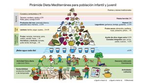 La pirámide infantil y juvenil Dieta Mediterránea recoge recomendaciones nutricionales basadas en evidencias científicas para apoyar el desarrollo físico y mental en las primeras etapas de la vida. Los pilares tradicionales de la Dieta Mediterránea—frutas, verduras, legumbres, frutos secos, cereales integrales y aceite de oliva virgen extra—siguen siendo la base del modelo. Además, se destaca la importancia de un consumo equilibrado de pescado, productos lácteos y carne, especialmente cruciales en el desarrollo infantil y juvenil.