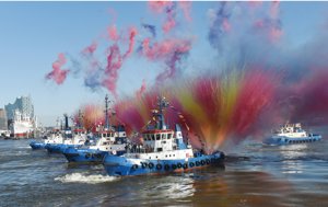 On Saturday at 3:45 pm, the unique tugboat ballet will be performed against the backdrop of Hamburg Harbour. In a fascinating choreography, nimble tugs boasting up to 3000 hp will dance to music on the Elbe in an impressive symphony.