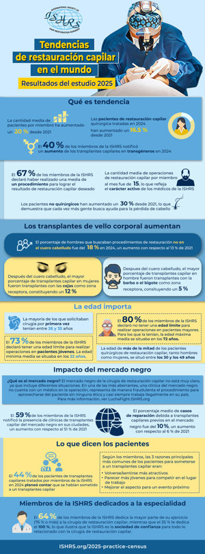 Realizada por Relevant Research Consulting of Evanston, IL, EE. UU., el ISHRS 2025 Practice Census es una recopilación de información proporcionada únicamente por los médicos participantes. La información publicada en esta encuesta se elaboró a partir de datos históricos reales y no incluye información proyectada. El margen de error de la muestra es de ±5,4 % con un nivel de confianza del 95 %. Para obtener una reimpresión completa del Informe del ISHRS 2025 Practice Census Report, visite Hair Restoration Statistics.