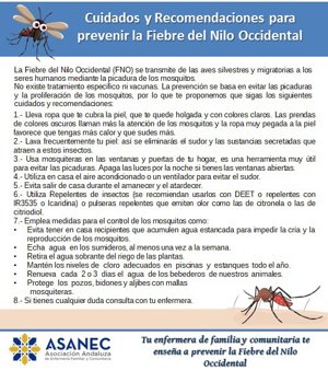 La Asociación Andaluza de Enfermería Familiar Comunitaria (ASANEC) ha lanzado este jueves una campaña de concienciación y prevención para evitar el Virus del Nilo Occidental basándose en todas las recomendaciones aportadas por la Consejería de Salud y Consumo de Andalucía.