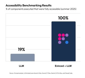 En verano de 2025, Evinced realizó pruebas de referencia con Cursor y diversos LLM conocidos por su alta resolución de problemas de codificación (Sonnet, Gemini, etc.). En cada prueba, se le indicó al sistema de codificación que creara uno de los 21 componentes web comunes. ¿El resultado? Evinced obtuvo un rendimiento cinco veces superior.